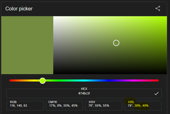 In the meantime, if needed, you can absolutely use other methods to determine this. Take the color “#748c3f” for example. Going to Google.com and using their “Color picker” tool can let you easily see these values: