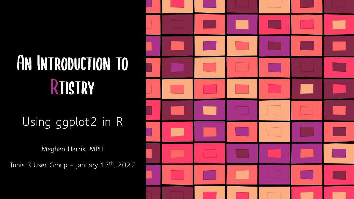 In this introductory presentation, we will briefly go over the basics of creating generative art in R (Rtistry) using the ggplot2 package. This presentation will go over the common geoms (geometries), aesthetics, layering, and functions that can be used for Rtistry creation. The presentation will conclude with a live code review session of one Rtistry pieces. Full annotated code will be shared with participants for further practice and use.